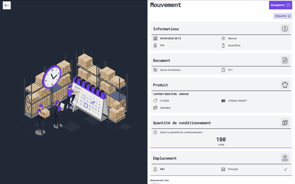 permet d’ajouter un pointage pour un seul produit à la fois. Dans l’écran Mouvement, vous pourrez modifier la quantité du pointage, son emplacement et ses informations de lot ou numéro de série si besoin.