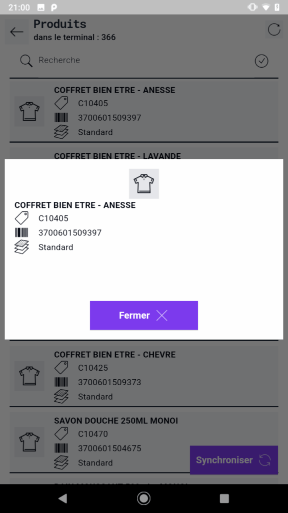 Le bouton « Synchroniser » permet d’importer sur le terminal les emplacements et les produits.
