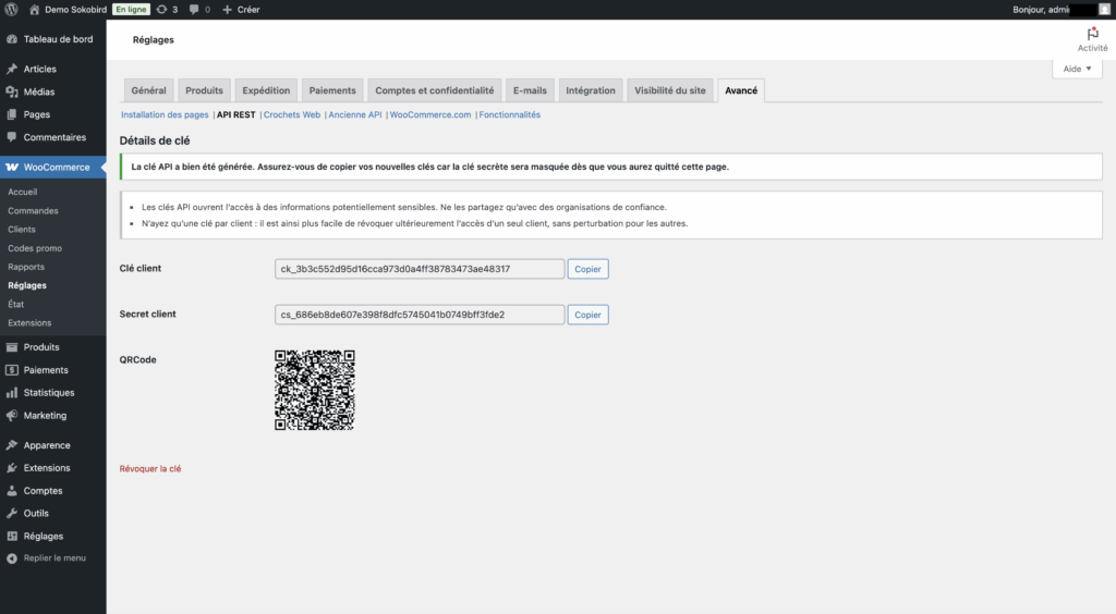 Dans le champ « Consumer key« , saisir la clé client copiée du backoffice de WooCommerce.